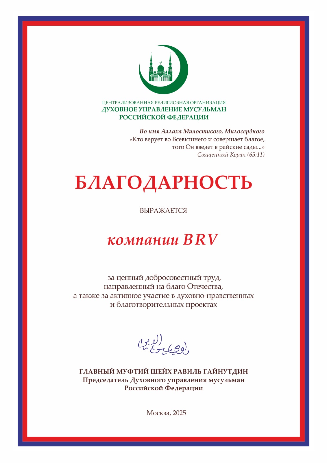 Наша компания получила благодарственное письмо от Духовного управления мусульман РФ. Мы приняли участие в благотворительной инициативе, направленной на поддержку ребят, находящихся в зоне СВО.